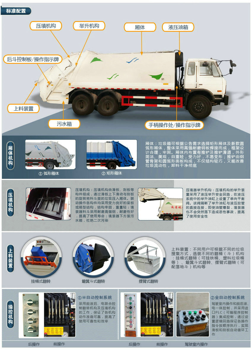 1、該車選用3950,4500軸距底盤。2、隨底盤選裝駕駛室。3、該車有五種可選翻轉(zhuǎn)樣式,A:三角斗裝置,B:掛桶裝置,C:擺臂裝置,D:大落地斗裝置,E:無后翻轉(zhuǎn)裝置。當(dāng)選擇ABCD時(shí),該車前懸(mm)/整車長(mm)/軸距(mm)/后懸(mm)的對應(yīng)關(guān)系為:1450/8470/4500/2520,1250/8270/4500/2520,1450/7920/3950/2520,1250/7720/3950/2520;當(dāng)選擇E時(shí),該車前懸(mm)/整車長(mm)/軸距(mm)/后懸(mm)的對應(yīng)關(guān)系為:1450/8410/4500/2460, 1250/8210/4500/2460,1450/7860/3950/2460,1250/7660/3950/2460。4、防護(hù)材料:Q235碳鋼,連接方式:左右側(cè)面防護(hù)采用焊接連接在副梁上,后部防護(hù)由專用裝置代替豁免。5、選裝ABS, ABS型號為3631010-C2000,生產(chǎn)廠家為東科克諾爾商用車制動(dòng)系統(tǒng)(十堰)有限公司。6、車輛顏色、文字噴涂及局部細(xì)節(jié)可變化。7、采用發(fā)動(dòng)機(jī)與油耗值對應(yīng)關(guān)系為(L/100km):ISB170 50/23.8, ISB190 50/23.8, YC4E140-56/23.8。